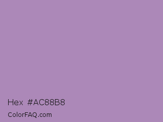 Hex #ac88b8 Color is a light purple color and the nearest color is African Violet #b284be. Hex code #ac88b8 and RGB value is rgb(172,136,184). In RGB color space, this color is composed of 67% red, 53% green, 72% blue, In CMYK color space, this color is composed of 7% cyan, 26% magenta, 0% yellow , 28% black , In HSL color space, this color has a hue angle of 285° , 25% saturation and 63% lightness.