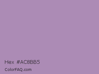 Hex #ac8bb5 Color is a light purple color and the nearest color is Glossy Grape #ab92b3. Hex code #ac8bb5 and RGB value is rgb(172,139,181). In RGB color space, this color is composed of 67% red, 55% green, 71% blue, In CMYK color space, this color is composed of 5% cyan, 23% magenta, 0% yellow , 29% black , In HSL color space, this color has a hue angle of 287° , 22% saturation and 63% lightness.