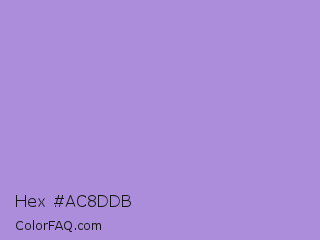 Hex #ac8ddb Color is a light violet color and the nearest color is East Side #ac91ce. Hex code #ac8ddb and RGB value is rgb(172,141,219). In RGB color space, this color is composed of 67% red, 55% green, 86% blue, In CMYK color space, this color is composed of 21% cyan, 36% magenta, 0% yellow , 14% black , In HSL color space, this color has a hue angle of 264° , 52% saturation and 71% lightness.