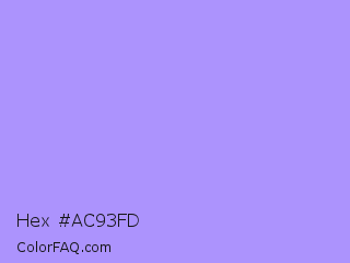 Hex #ac93fd Color is a light indigo color and the nearest color is Dull Lavender #a899e6. Hex code #ac93fd and RGB value is rgb(172,147,253). In RGB color space, this color is composed of 67% red, 58% green, 99% blue, In CMYK color space, this color is composed of 32% cyan, 42% magenta, 0% yellow , 1% black , In HSL color space, this color has a hue angle of 254° , 96% saturation and 78% lightness.