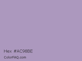 Hex #ac98be Color is a light purple color and the nearest color is Glossy Grape #ab92b3. Hex code #ac98be and RGB value is rgb(172,152,190). In RGB color space, this color is composed of 67% red, 60% green, 75% blue, In CMYK color space, this color is composed of 9% cyan, 20% magenta, 0% yellow , 25% black , In HSL color space, this color has a hue angle of 272° , 23% saturation and 67% lightness.