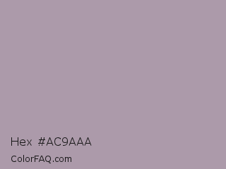 Hex #ac9aaa Color is a light magenta color and the nearest color is Lilac Luster #ae98aa. Hex code #ac9aaa and RGB value is rgb(172,154,170). In RGB color space, this color is composed of 67% red, 60% green, 67% blue, In CMYK color space, this color is composed of 0% cyan, 10% magenta, 1% yellow , 33% black , In HSL color space, this color has a hue angle of 307° , 10% saturation and 64% lightness.