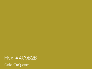 Hex #ac9b2b Color is a normal yellow color and the nearest color is Lemon Ginger #ac9e22. Hex code #ac9b2b and RGB value is rgb(172,155,43). In RGB color space, this color is composed of 67% red, 61% green, 17% blue, In CMYK color space, this color is composed of 0% cyan, 10% magenta, 75% yellow , 33% black , In HSL color space, this color has a hue angle of 52° , 60% saturation and 42% lightness.