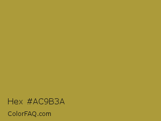 Hex #ac9b3a Color is a normal yellow color and the nearest color is Brass #b5a642. Hex code #ac9b3a and RGB value is rgb(172,155,58). In RGB color space, this color is composed of 67% red, 61% green, 23% blue, In CMYK color space, this color is composed of 0% cyan, 10% magenta, 66% yellow , 33% black , In HSL color space, this color has a hue angle of 51° , 50% saturation and 45% lightness.