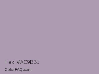 Hex #ac9bb1 Color is a light purple color and the nearest color is Lilac Luster #ae98aa. Hex code #ac9bb1 and RGB value is rgb(172,155,177). In RGB color space, this color is composed of 67% red, 61% green, 69% blue, In CMYK color space, this color is composed of 3% cyan, 12% magenta, 0% yellow , 31% black , In HSL color space, this color has a hue angle of 286° , 12% saturation and 65% lightness.