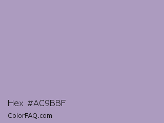 Hex #ac9bbf Color is a light violet color and the nearest color is Pastel Purple #b39eb5. Hex code #ac9bbf and RGB value is rgb(172,155,191). In RGB color space, this color is composed of 67% red, 61% green, 75% blue, In CMYK color space, this color is composed of 10% cyan, 19% magenta, 0% yellow , 25% black , In HSL color space, this color has a hue angle of 268° , 22% saturation and 68% lightness.