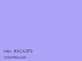 Hex #aca3f9 Color is a very light indigo color and the nearest color is Biloba Flower #b2a1ea. Hex code #aca3f9 and RGB value is rgb(172,163,249). In RGB color space, this color is composed of 67% red, 64% green, 98% blue, In CMYK color space, this color is composed of 31% cyan, 35% magenta, 0% yellow , 2% black , In HSL color space, this color has a hue angle of 246° , 88% saturation and 81% lightness.