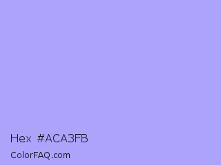 Hex #aca3fb Color is a very light indigo color and the nearest color is Biloba Flower #b2a1ea. Hex code #aca3fb and RGB value is rgb(172,163,251). In RGB color space, this color is composed of 67% red, 64% green, 98% blue, In CMYK color space, this color is composed of 31% cyan, 35% magenta, 0% yellow , 2% black , In HSL color space, this color has a hue angle of 246° , 92% saturation and 81% lightness.