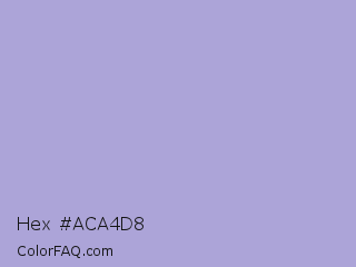 Hex #aca4d8 Color is a light indigo color and the nearest color is Cold Purple #aba0d9. Hex code #aca4d8 and RGB value is rgb(172,164,216). In RGB color space, this color is composed of 67% red, 64% green, 85% blue, In CMYK color space, this color is composed of 20% cyan, 24% magenta, 0% yellow , 15% black , In HSL color space, this color has a hue angle of 249° , 40% saturation and 75% lightness.