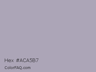 Hex #aca5b7 Color is a light violet color and the nearest color is Spun Pearl #aaabb7. Hex code #aca5b7 and RGB value is rgb(172,165,183). In RGB color space, this color is composed of 67% red, 65% green, 72% blue, In CMYK color space, this color is composed of 6% cyan, 10% magenta, 0% yellow , 28% black , In HSL color space, this color has a hue angle of 263° , 11% saturation and 68% lightness.