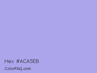 Hex #aca5eb Color is a light indigo color and the nearest color is Biloba Flower #b2a1ea. Hex code #aca5eb and RGB value is rgb(172,165,235). In RGB color space, this color is composed of 67% red, 65% green, 92% blue, In CMYK color space, this color is composed of 27% cyan, 30% magenta, 0% yellow , 8% black , In HSL color space, this color has a hue angle of 246° , 64% saturation and 78% lightness.