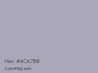 Hex #aca7b8 Color is a light indigo color and the nearest color is Spun Pearl #aaabb7. Hex code #aca7b8 and RGB value is rgb(172,167,184). In RGB color space, this color is composed of 67% red, 65% green, 72% blue, In CMYK color space, this color is composed of 7% cyan, 9% magenta, 0% yellow , 28% black , In HSL color space, this color has a hue angle of 258° , 11% saturation and 69% lightness.