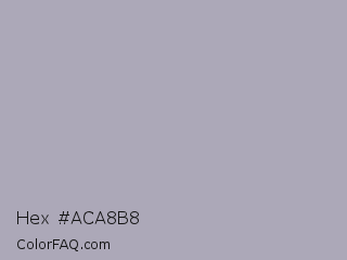 Hex #aca8b8 Color is a light indigo color and the nearest color is Spun Pearl #aaabb7. Hex code #aca8b8 and RGB value is rgb(172,168,184). In RGB color space, this color is composed of 67% red, 66% green, 72% blue, In CMYK color space, this color is composed of 7% cyan, 9% magenta, 0% yellow , 28% black , In HSL color space, this color has a hue angle of 255° , 10% saturation and 69% lightness.