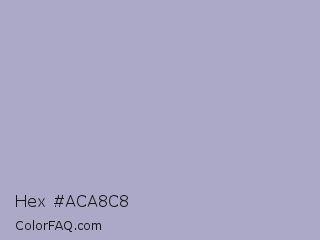 Hex #aca8c8 Color is a light indigo color and the nearest color is Logan #aaa9cd. Hex code #aca8c8 and RGB value is rgb(172,168,200). In RGB color space, this color is composed of 67% red, 66% green, 78% blue, In CMYK color space, this color is composed of 14% cyan, 16% magenta, 0% yellow , 22% black , In HSL color space, this color has a hue angle of 248° , 23% saturation and 72% lightness.
