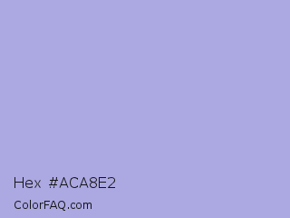 Hex #aca8e2 Color is a light indigo color and the nearest color is Maximum Blue Purple #acace6. Hex code #aca8e2 and RGB value is rgb(172,168,226). In RGB color space, this color is composed of 67% red, 66% green, 89% blue, In CMYK color space, this color is composed of 24% cyan, 26% magenta, 0% yellow , 11% black , In HSL color space, this color has a hue angle of 244° , 50% saturation and 77% lightness.