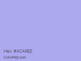 Hex #aca9ee Color is a light indigo color and the nearest color is Maximum Blue Purple #acace6. Hex code #aca9ee and RGB value is rgb(172,169,238). In RGB color space, this color is composed of 67% red, 66% green, 93% blue, In CMYK color space, this color is composed of 28% cyan, 29% magenta, 0% yellow , 7% black , In HSL color space, this color has a hue angle of 243° , 67% saturation and 80% lightness.