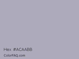 Hex #acaabb Color is a light indigo color and the nearest color is Spun Pearl #aaabb7. Hex code #acaabb and RGB value is rgb(172,170,187). In RGB color space, this color is composed of 67% red, 67% green, 73% blue, In CMYK color space, this color is composed of 8% cyan, 9% magenta, 0% yellow , 27% black , In HSL color space, this color has a hue angle of 247° , 11% saturation and 70% lightness.