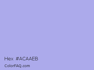Hex #acaaeb Color is a light indigo color and the nearest color is Maximum Blue Purple #acace6. Hex code #acaaeb and RGB value is rgb(172,170,235). In RGB color space, this color is composed of 67% red, 67% green, 92% blue, In CMYK color space, this color is composed of 27% cyan, 28% magenta, 0% yellow , 8% black , In HSL color space, this color has a hue angle of 242° , 62% saturation and 79% lightness.