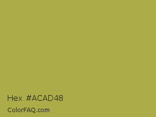 Hex #acad48 Color is a normal yellow color and the nearest color is Brass #b5a642. Hex code #acad48 and RGB value is rgb(172,173,72). In RGB color space, this color is composed of 67% red, 68% green, 28% blue, In CMYK color space, this color is composed of 1% cyan, 0% magenta, 58% yellow , 32% black , In HSL color space, this color has a hue angle of 61° , 41% saturation and 48% lightness.