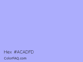 Hex #acadfd Color is a very light blue color and the nearest color is Perano #a9bef2. Hex code #acadfd and RGB value is rgb(172,173,253). In RGB color space, this color is composed of 67% red, 68% green, 99% blue, In CMYK color space, this color is composed of 32% cyan, 32% magenta, 0% yellow , 1% black , In HSL color space, this color has a hue angle of 239° , 95% saturation and 83% lightness.