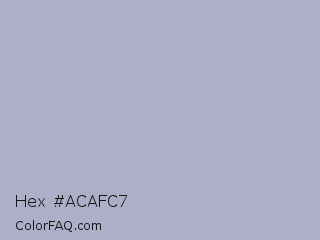 Hex #acafc7 Color is a light blue color and the nearest color is Cadet Blue #a9b2c3. Hex code #acafc7 and RGB value is rgb(172,175,199). In RGB color space, this color is composed of 67% red, 69% green, 78% blue, In CMYK color space, this color is composed of 14% cyan, 12% magenta, 0% yellow , 22% black , In HSL color space, this color has a hue angle of 233° , 19% saturation and 73% lightness.