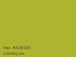 Hex #acb430 Color is a normal yellow color and the nearest color is Android Green #a4c639. Hex code #acb430 and RGB value is rgb(172,180,48). In RGB color space, this color is composed of 67% red, 71% green, 19% blue, In CMYK color space, this color is composed of 4% cyan, 0% magenta, 73% yellow , 29% black , In HSL color space, this color has a hue angle of 64° , 58% saturation and 45% lightness.