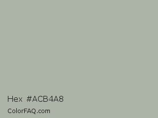 Hex #acb4a8 Color is a light green color and the nearest color is Silver Chalice #acacac. Hex code #acb4a8 and RGB value is rgb(172,180,168). In RGB color space, this color is composed of 67% red, 71% green, 66% blue, In CMYK color space, this color is composed of 4% cyan, 0% magenta, 7% yellow , 29% black , In HSL color space, this color has a hue angle of 100° , 7% saturation and 68% lightness.