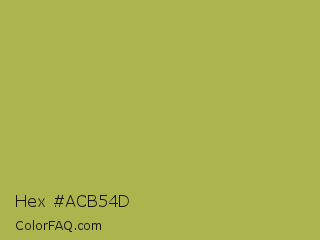 Hex #acb54d Color is a normal yellow color and the nearest color is Olive Green #b5b35c. Hex code #acb54d and RGB value is rgb(172,181,77). In RGB color space, this color is composed of 67% red, 71% green, 30% blue, In CMYK color space, this color is composed of 5% cyan, 0% magenta, 57% yellow , 29% black , In HSL color space, this color has a hue angle of 65° , 41% saturation and 51% lightness.