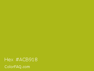 Hex #acb918 Color is a normal yellow color and the nearest color is Acid Green #b0bf1a. Hex code #acb918 and RGB value is rgb(172,185,24). In RGB color space, this color is composed of 67% red, 73% green, 9% blue, In CMYK color space, this color is composed of 7% cyan, 0% magenta, 87% yellow , 27% black , In HSL color space, this color has a hue angle of 65° , 77% saturation and 41% lightness.