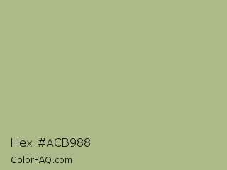 Hex #acb988 Color is a light lime color and the nearest color is Swamp Green #acb78e. Hex code #acb988 and RGB value is rgb(172,185,136). In RGB color space, this color is composed of 67% red, 73% green, 53% blue, In CMYK color space, this color is composed of 7% cyan, 0% magenta, 26% yellow , 27% black , In HSL color space, this color has a hue angle of 76° , 26% saturation and 63% lightness.