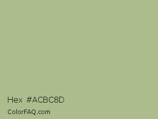 Hex #acbc8d Color is a light green color and the nearest color is Swamp Green #acb78e. Hex code #acbc8d and RGB value is rgb(172,188,141). In RGB color space, this color is composed of 67% red, 74% green, 55% blue, In CMYK color space, this color is composed of 9% cyan, 0% magenta, 25% yellow , 26% black , In HSL color space, this color has a hue angle of 80° , 26% saturation and 65% lightness.