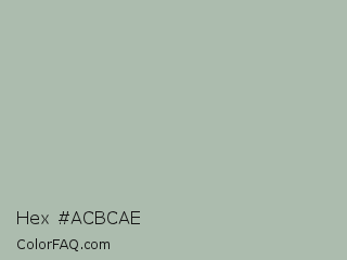 Hex #acbcae Color is a light green color and the nearest color is Ash Gray #b2beb5. Hex code #acbcae and RGB value is rgb(172,188,174). In RGB color space, this color is composed of 67% red, 74% green, 68% blue, In CMYK color space, this color is composed of 9% cyan, 0% magenta, 7% yellow , 26% black , In HSL color space, this color has a hue angle of 128° , 11% saturation and 71% lightness.