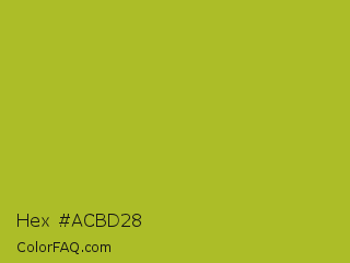 Hex #acbd28 Color is a normal yellow color and the nearest color is Acid Green #b0bf1a. Hex code #acbd28 and RGB value is rgb(172,189,40). In RGB color space, this color is composed of 67% red, 74% green, 16% blue, In CMYK color space, this color is composed of 9% cyan, 0% magenta, 79% yellow , 26% black , In HSL color space, this color has a hue angle of 67° , 65% saturation and 45% lightness.