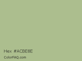 Hex #acbe8e Color is a light green color and the nearest color is Swamp Green #acb78e. Hex code #acbe8e and RGB value is rgb(172,190,142). In RGB color space, this color is composed of 67% red, 75% green, 56% blue, In CMYK color space, this color is composed of 9% cyan, 0% magenta, 25% yellow , 25% black , In HSL color space, this color has a hue angle of 83° , 27% saturation and 65% lightness.