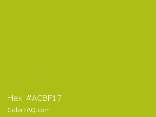 Hex #acbf17 Color is a normal yellow color and the nearest color is Acid Green #b0bf1a. Hex code #acbf17 and RGB value is rgb(172,191,23). In RGB color space, this color is composed of 67% red, 75% green, 9% blue, In CMYK color space, this color is composed of 10% cyan, 0% magenta, 88% yellow , 25% black , In HSL color space, this color has a hue angle of 67° , 79% saturation and 42% lightness.