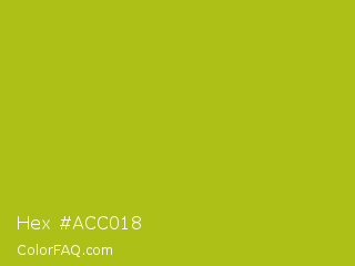 Hex #acc018 Color is a normal yellow color and the nearest color is Acid Green #b0bf1a. Hex code #acc018 and RGB value is rgb(172,192,24). In RGB color space, this color is composed of 67% red, 75% green, 9% blue, In CMYK color space, this color is composed of 10% cyan, 0% magenta, 88% yellow , 25% black , In HSL color space, this color has a hue angle of 67° , 78% saturation and 42% lightness.