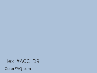 Hex #acc1d9 Color is a light blue color and the nearest color is Pigeon Post #afbdd9. Hex code #acc1d9 and RGB value is rgb(172,193,217). In RGB color space, this color is composed of 67% red, 76% green, 85% blue, In CMYK color space, this color is composed of 21% cyan, 11% magenta, 0% yellow , 15% black , In HSL color space, this color has a hue angle of 212° , 37% saturation and 76% lightness.