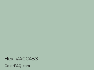Hex #acc4b3 Color is a light green color and the nearest color is Spring Rain #accbb1. Hex code #acc4b3 and RGB value is rgb(172,196,179). In RGB color space, this color is composed of 67% red, 77% green, 70% blue, In CMYK color space, this color is composed of 12% cyan, 0% magenta, 9% yellow , 23% black , In HSL color space, this color has a hue angle of 138° , 17% saturation and 72% lightness.