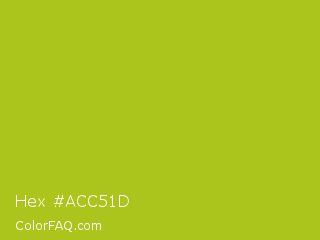 Hex #acc51d Color is a normal yellow color and the nearest color is Acid Green #b0bf1a. Hex code #acc51d and RGB value is rgb(172,197,29). In RGB color space, this color is composed of 67% red, 77% green, 11% blue, In CMYK color space, this color is composed of 13% cyan, 0% magenta, 85% yellow , 23% black , In HSL color space, this color has a hue angle of 69° , 74% saturation and 44% lightness.