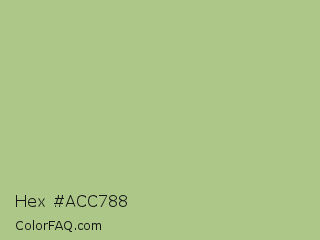 Hex #acc788 Color is a light green color and the nearest color is Swamp Green #acb78e. Hex code #acc788 and RGB value is rgb(172,199,136). In RGB color space, this color is composed of 67% red, 78% green, 53% blue, In CMYK color space, this color is composed of 14% cyan, 0% magenta, 32% yellow , 22% black , In HSL color space, this color has a hue angle of 86° , 36% saturation and 66% lightness.