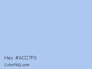 Hex #acc7f0 Color is a very light blue color and the nearest color is Pale Cornflower Blue #abcdef. Hex code #acc7f0 and RGB value is rgb(172,199,240). In RGB color space, this color is composed of 67% red, 78% green, 94% blue, In CMYK color space, this color is composed of 28% cyan, 17% magenta, 0% yellow , 6% black , In HSL color space, this color has a hue angle of 216° , 69% saturation and 81% lightness.