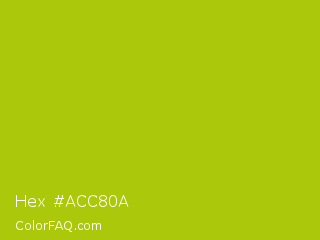 Hex #acc80a Color is a normal yellow color and the nearest color is Bahia #a5cb0c. Hex code #acc80a and RGB value is rgb(172,200,10). In RGB color space, this color is composed of 67% red, 78% green, 4% blue, In CMYK color space, this color is composed of 14% cyan, 0% magenta, 95% yellow , 22% black , In HSL color space, this color has a hue angle of 69° , 90% saturation and 41% lightness.