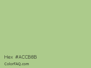Hex #accb8b Color is a light green color and the nearest color is Swamp Green #acb78e. Hex code #accb8b and RGB value is rgb(172,203,139). In RGB color space, this color is composed of 67% red, 80% green, 55% blue, In CMYK color space, this color is composed of 15% cyan, 0% magenta, 32% yellow , 20% black , In HSL color space, this color has a hue angle of 89° , 38% saturation and 67% lightness.