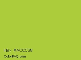 Hex #accc38 Color is a normal lime color and the nearest color is Android Green #a4c639. Hex code #accc38 and RGB value is rgb(172,204,56). In RGB color space, this color is composed of 67% red, 80% green, 22% blue, In CMYK color space, this color is composed of 16% cyan, 0% magenta, 73% yellow , 20% black , In HSL color space, this color has a hue angle of 73° , 59% saturation and 51% lightness.