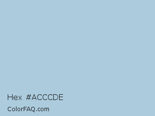 Hex #acccde Color is a light blue color and the nearest color is Light Steel Blue #b0c4de. Hex code #acccde and RGB value is rgb(172,204,222). In RGB color space, this color is composed of 67% red, 80% green, 87% blue, In CMYK color space, this color is composed of 23% cyan, 8% magenta, 0% yellow , 13% black , In HSL color space, this color has a hue angle of 202° , 43% saturation and 77% lightness.