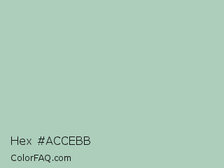 Hex #accebb Color is a light green color and the nearest color is Spring Rain #accbb1. Hex code #accebb and RGB value is rgb(172,206,187). In RGB color space, this color is composed of 67% red, 81% green, 73% blue, In CMYK color space, this color is composed of 17% cyan, 0% magenta, 9% yellow , 19% black , In HSL color space, this color has a hue angle of 146° , 26% saturation and 74% lightness.