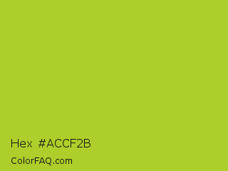 Hex #accf2b Color is a normal lime color and the nearest color is Android Green #a4c639. Hex code #accf2b and RGB value is rgb(172,207,43). In RGB color space, this color is composed of 67% red, 81% green, 17% blue, In CMYK color space, this color is composed of 17% cyan, 0% magenta, 79% yellow , 19% black , In HSL color space, this color has a hue angle of 73° , 66% saturation and 49% lightness.