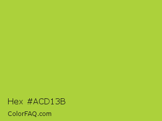 Hex #acd13b Color is a normal lime color and the nearest color is Android Green #a4c639. Hex code #acd13b and RGB value is rgb(172,209,59). In RGB color space, this color is composed of 67% red, 82% green, 23% blue, In CMYK color space, this color is composed of 18% cyan, 0% magenta, 72% yellow , 18% black , In HSL color space, this color has a hue angle of 75° , 62% saturation and 53% lightness.