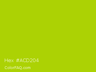 Hex #acd204 Color is a normal lime color and the nearest color is Vivid Lime Green #a6d608. Hex code #acd204 and RGB value is rgb(172,210,4). In RGB color space, this color is composed of 67% red, 82% green, 2% blue, In CMYK color space, this color is composed of 18% cyan, 0% magenta, 98% yellow , 18% black , In HSL color space, this color has a hue angle of 71° , 96% saturation and 42% lightness.