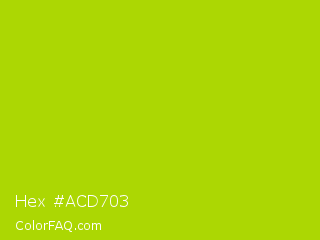 Hex #acd703 Color is a normal lime color and the nearest color is Vivid Lime Green #a6d608. Hex code #acd703 and RGB value is rgb(172,215,3). In RGB color space, this color is composed of 67% red, 84% green, 1% blue, In CMYK color space, this color is composed of 20% cyan, 0% magenta, 99% yellow , 16% black , In HSL color space, this color has a hue angle of 72° , 97% saturation and 43% lightness.